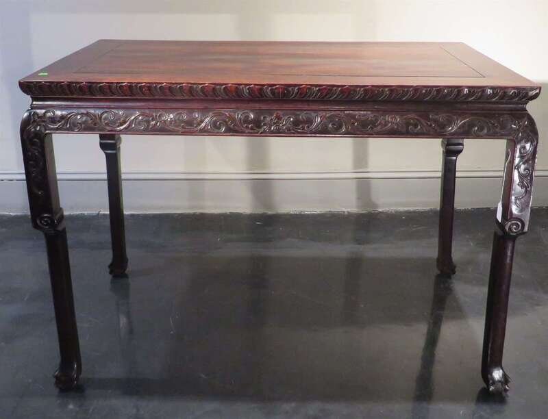 Plain panel top, short indented frieze and shaped apron finely carved with foliate bands continuing onto square-section legs terminating in outward flanking scroll-toed feet.