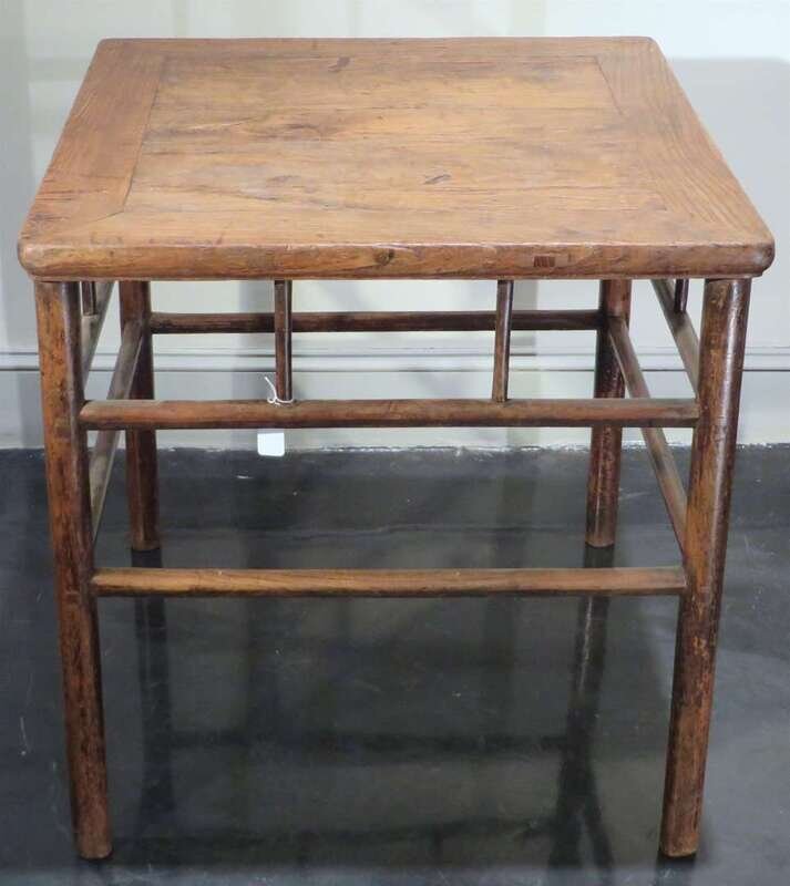 Waistless, round corner legs, three planks inset into square top with round edge, framed by high stretchers seperated by short vertical struts and low even-height stretchers.