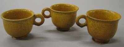 Cups with handles covered in uneven mustard yellow glaze leaving out the base.