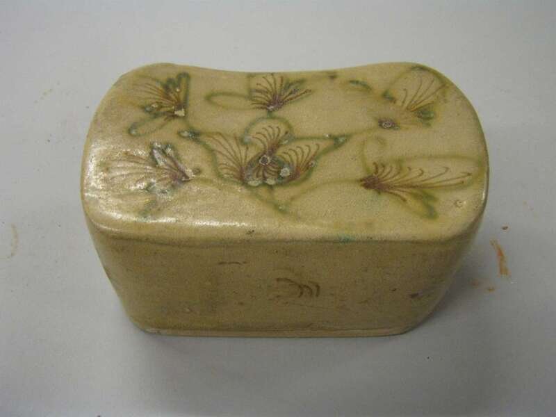 Glazed with slip and straw craquelure, decorated to face in freehanded green and brown brushstrokes depicting flowers.