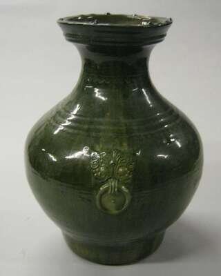 Wide baluster form, with moulded faux-ring mask handles and string bands decorated to the body.