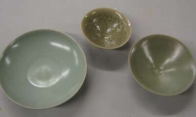 Comprising a shallow celadon bowl with a petal-like texture to exterior, a plain conical bowl raised on narrow footring, and a carved yueyao bowl with floral design.