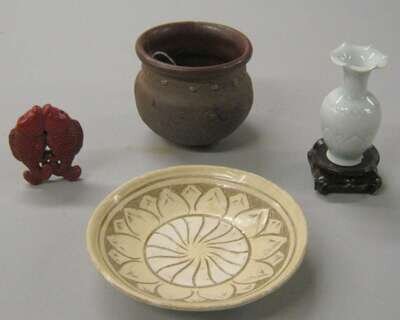 Including a yingqing miniature vase, a double carp lacquer carving, a miniature pottery urn, and a incised ivory glazed dish.