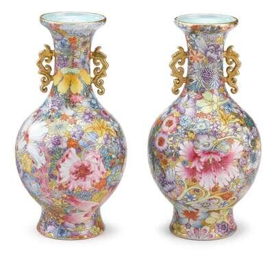 Pair of Chinese famille rose millefleur ovoid vases qianlong mark, 20th century