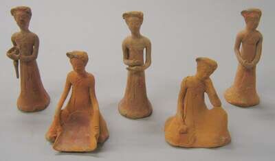 Five terracotta musician figures; unglazed and with some pigmentation to hair.