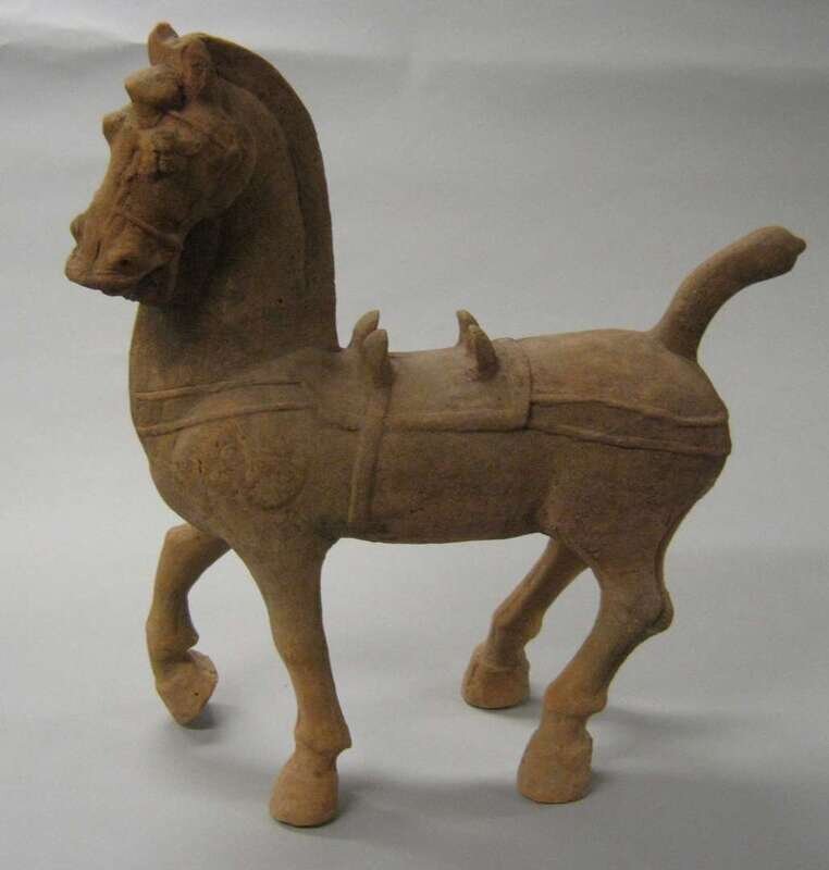 Standing horse with typical hogged mane and tied tail, thick neck and open mouth, one leg striding forward.