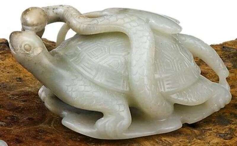 The celadon and mottled grey jade carving depicts a turtle and intertwined serpent on a large lotus leaf.