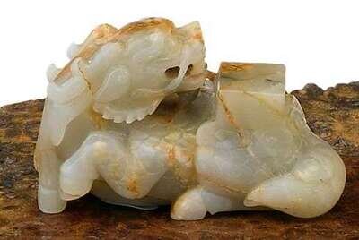 Carved as a recumbant qiling with a stack of books on its back, stone with grain inclusions.
