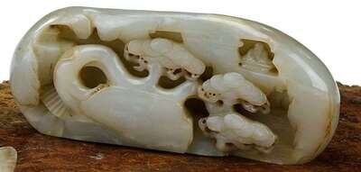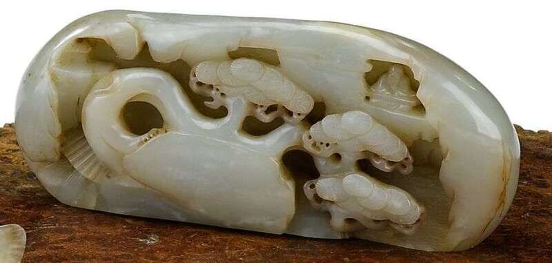 The horizontal, pebble-form carving shows pine trees, houses, and a lone scholar in mountain niches.