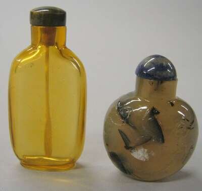 Including a transparent yellow glass snuff bottle and a carved quartz snuff bottle.