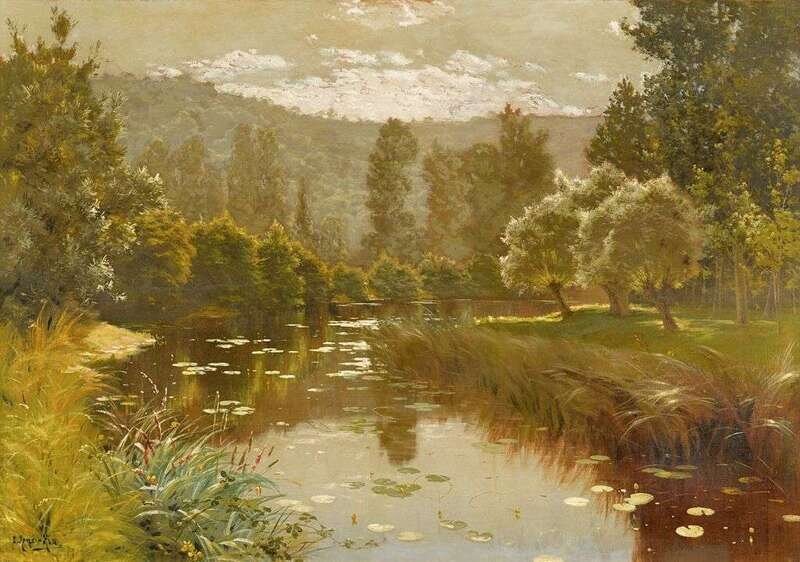 RENÉ CHARLES EDMOND HIS (FRENCH 1877-1960) WATER LILLIES IN A STREAM