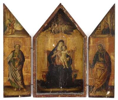 MANNER OF GIOVANNI DI PAOLO (ITALIAN ACTIVE CIRCA 1420-1482) A TRIPTYCH: THE CENTRAL PANEL, VIRGIN AND CHILD WITH GOD THE FATHER ABOVE, CENTERED BY THE VIRGIN ANNUNCIATE; THE LEFT PANEL, SAINT PETER; THE RIGHT PANEL, SAINT PAUL