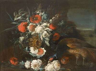 FOLLOWER OF JAKOB BOGDANI (HUNGARIAN 1660-1724) PHEASANT AND MIXED FLOWERS IN A LANDSCAPE