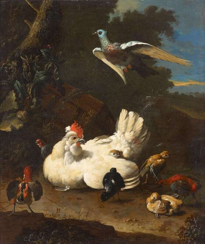 ADRIAEN VAN OOLEN (DUTCH 1651-1694) A HEN AND CHICKS WITH A PIGEON IN A LANDSCAPE