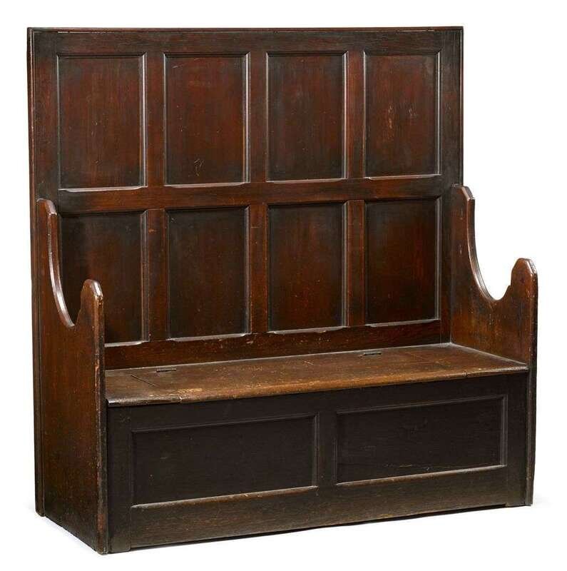 The tall panelled back over rectangular lift-top storage chest framed by U-shaped arms.