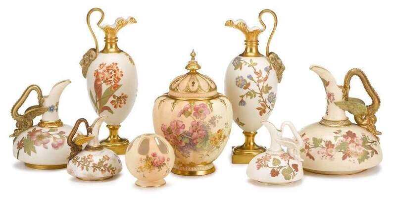 Collection of eight Royal Worcester painted and gilt porcelain vases 1886-1892