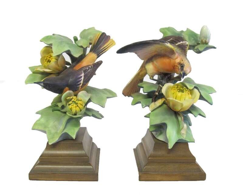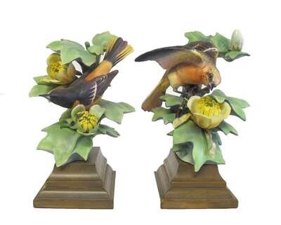 Each realistically modeled and painted to depict a pair of Baltimore Orioles perched upon blossoming foliage, on custom wood bases, each marked for Royal Worcester and artist signed.