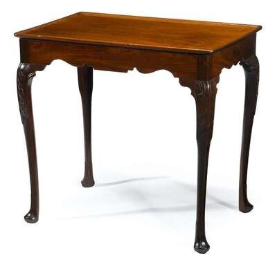 The rectangular dished top over shaped apron raised on slender leaf-carved cabriole legs terminating in trifid feet.