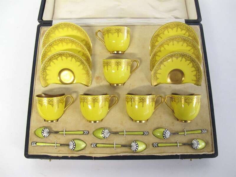 Comprising six each yellow glazed and gilt demitasse cups and saucers, printed factory mark to underside, and six enameled silver demitasse spoons struck with London import marks for 1914-15, maker's mark HH, in original silk-lined box.