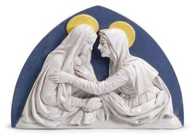 Modeled to depict the meeting of Mary and Elizabeth, the figures in relief and white glaze against a sky blue ground, indistinguishable markings and numbers to top edge.