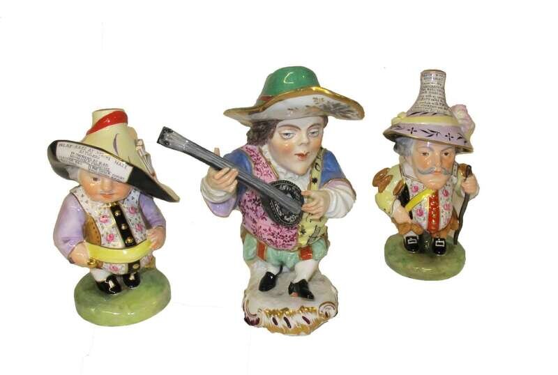 The two Derby figures painted with advertising broadsides to their hats, both signed to underside with red crown over crossed swords mark and signed J. Gould; together with a third porcelain figure with a mandolin, incised 10, 8 to underside.