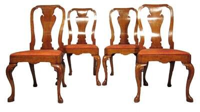 The rounded and shaped backs over vasiform splats, drop-in seat, raised on cabriole legs terminating in pad feet.