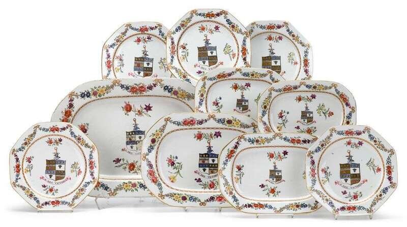 Comprising a large rectangular platter, five octagonal plates, two smaller platters of graduating size and two smaller dishes, all centrally painted with the motto "A Deo Victoria" below the arms of the Graeme family of Inchbrakie, Scotland, (probably Patrick James Frederick Graeme, 11th Laird, b. 1849), within borders of floral garlands. (10).
