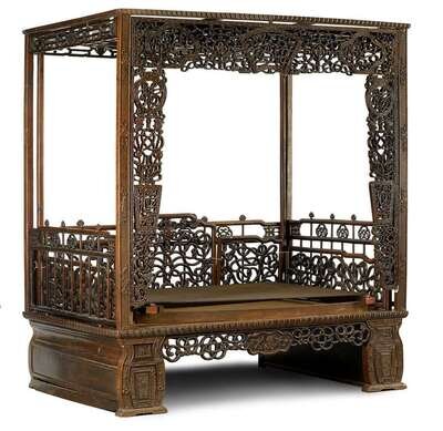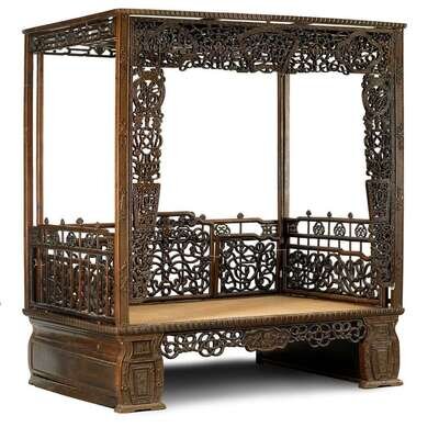 With an endless knot lattice work design which incorporates various other auspicious symbols, woven rattan platform, hollow feet span the width and enclose drawers at one side.