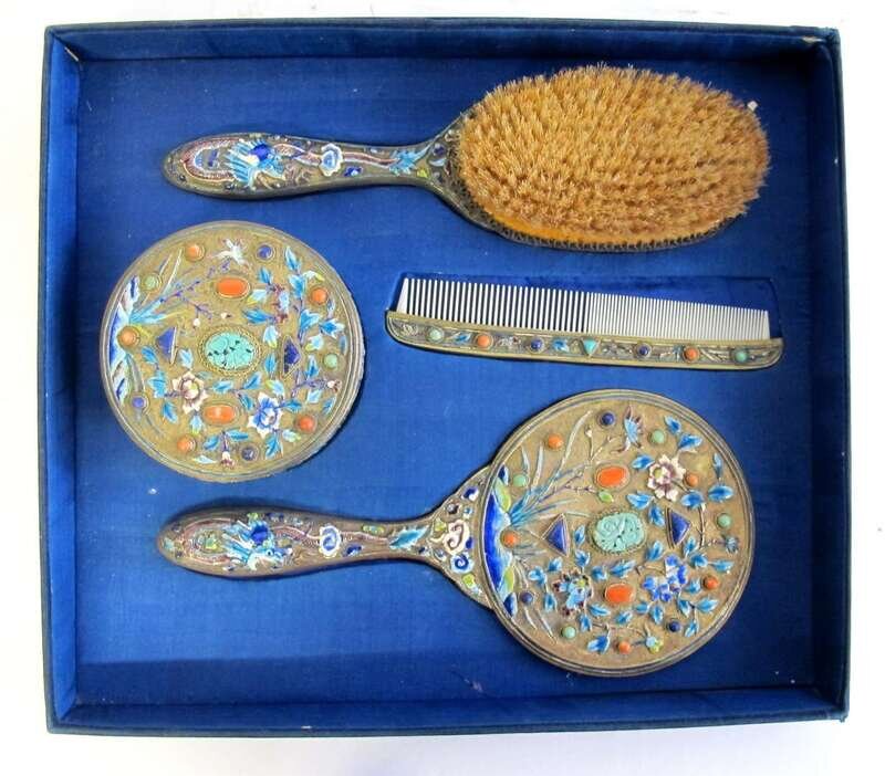 The silk-lined boxed set includes hand mirror, brush, comb, and lidded dresser box, each chased and polychrome enameled with dragons and foliage and inset with semi-precious stones. (4).