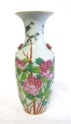 The baluster form enamel painted to one side with birds and chrysanthemum blossoms, the other side painted with Chinese characters, the shoulders modeled in relief with fu-dogs and rings.