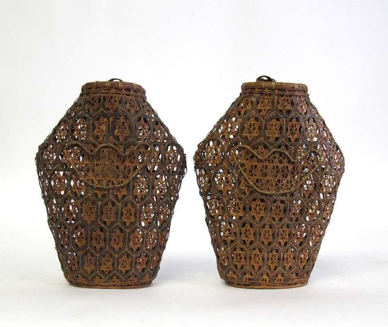 Each of compressed urn-form with woven star motif, the circular opening fit with a full-length bamboo insert.