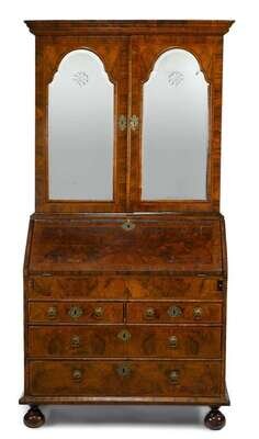 In two sections, the ogee molded cornice over twin arched panelled mirrored doors carved to show stars, opening to shelves, the lower section with drop-down slope opening to a tooled leather writing surface and a series of pigeon holes, above two short and two long drawers, raised on bun feet.