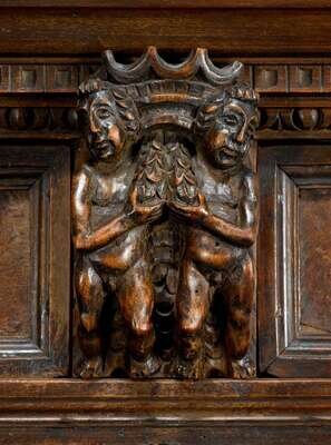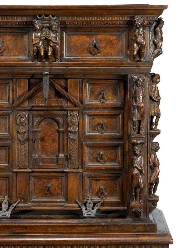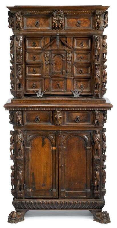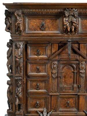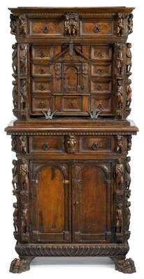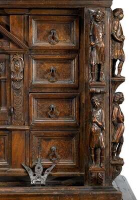 In two sections, the upper section with three drawers over an architectural arrangement of drawers around prospect door, the lower section with two drawers over two cupboard doors, raised on paw feet, the whole carved to show numerous figures all over.