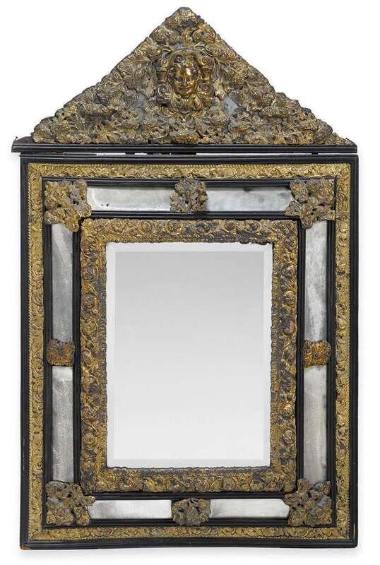The central rectangular bevelled glass plate within a border of narrow mirror plates, surmounted by a triangular pediment with pressed brass onlay showing foliate scrolls centered by a mask.