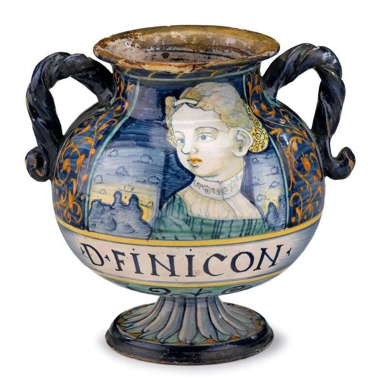 The bulbous body painted on one side to show the head and shoulders of a young boy with landscape beyond, flanked by orange scrolls on a blue ground, above the script " D FINICON", the other side painted with cobalt blue scrolls on a white ground, two twisted scroll handles to shoulder.