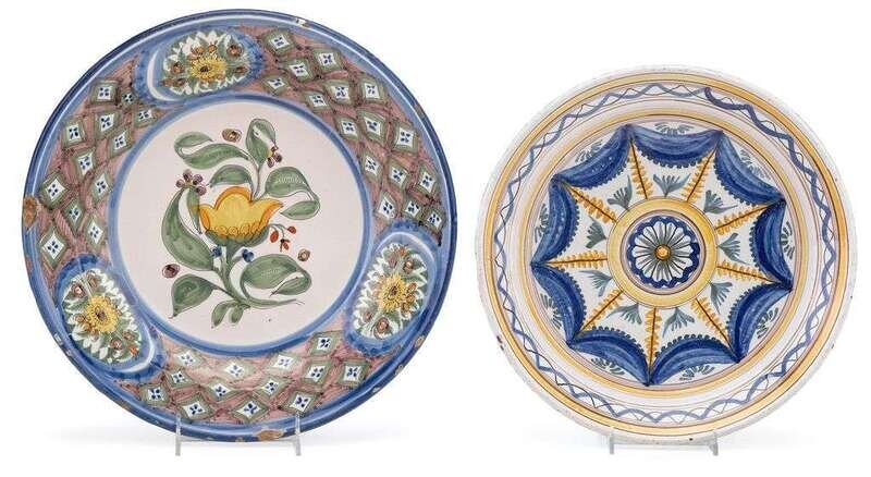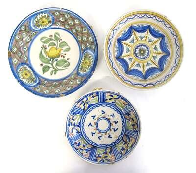 Both of circular dished form, the larger with flowers to reserve and a border of floral ovals against a green and purple diaper ground, the other with a pinwheel pattern of blue, mustard and yellow with a double swag border; together with a reconstructed charger decorated in blue, orange, green and yellow. (3).