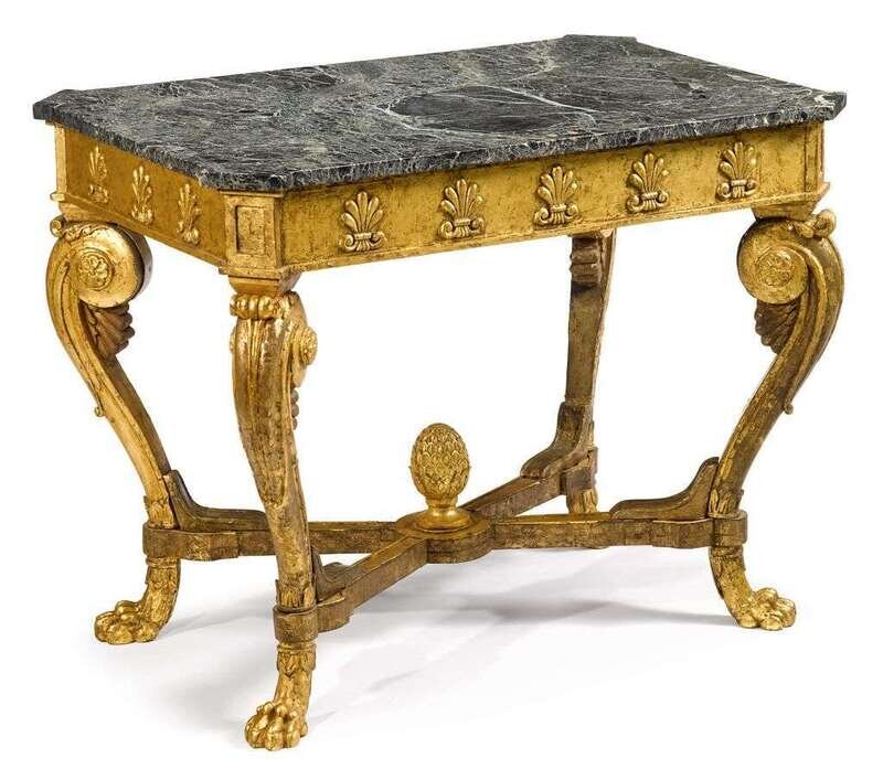 Rectangular veined green marble top with canted corners over conforming giltwood base, the frieze with raised palmettes supported on scroll tapering legs joined by X-frame stretcher centered by vegetable-form finial, terminating in paw feet.