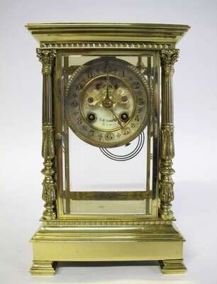 The brass case inset with beveled glass panes, the brass dial with black arabic numerals, the center mounted with open escapement of engraved griffins, the fore-case mounted with twin columns, supported on bracket feet, dial marked C.D. Peacock Chicago, movement stamped A1, 1003, 500, 45.