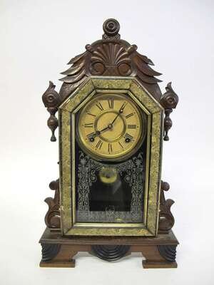 The walnut case with arched and carved crest flanked by two drop pendants, over glazed and stenciled door with faux-marble painting, the circular paper dial with breguet hands, brass 8-day movement with pendulum, raised on rectangular base accented with ebonized half and quarter-round moldings, brass dial plate illegibly stamped Pat 10 78.