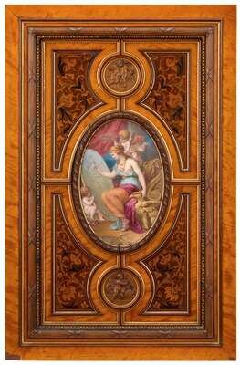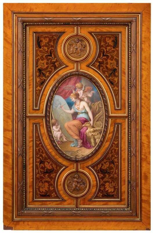 Possibly converted from a cabinet door, centered by a finely painted oval depicting an allegory of the arts, within four marquetry inlaid spandrels, and a carved roundel above and below, maker's plaque "Johnstone Norman & co., Manufacturers, 67 New Bond Street, London" to reverse.