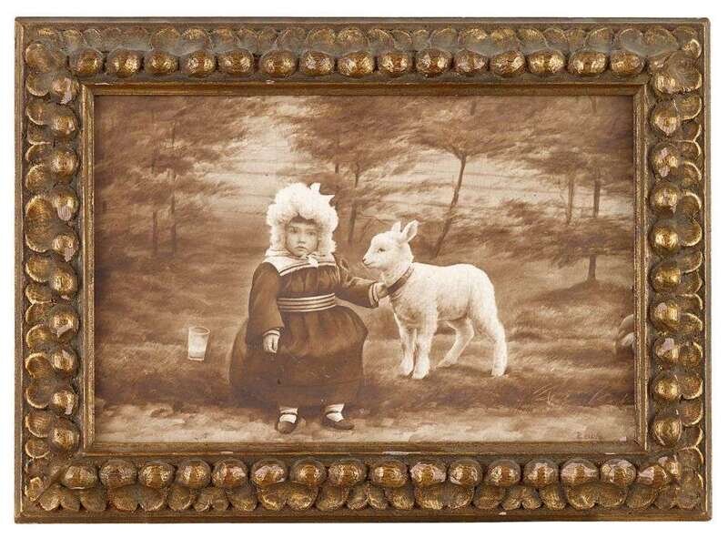 The rectangular plaque painted in sepia tones to depict a young girl with a lamb against a tree-dotted landscape, signed "Reuty" to bottom right, within a carved and gilt wood frame, the reverse of the plaque marked in ink "No. 24".