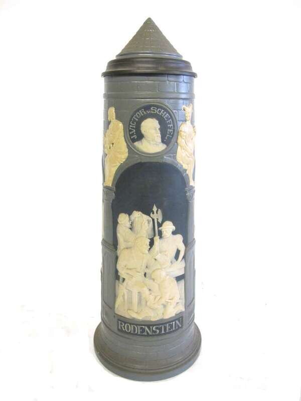 Cone-shaped and pewter mounted lid above tapering body cameo molded with figures in white against blue ground, depicting Joseph Victor von Scheffel, Perkeo of Heidelberg, Rodenstein, Hildebrand, and Enderle von Ketsch, impressed abbey mark VB, Gescesch, 2634, 29, 02.