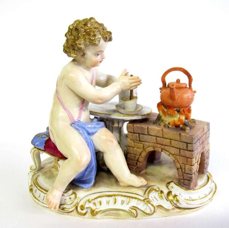 The seated putto figure stirring a hot beverage with stove and kettle, underglaze blue crossed sword mark, impressed 22, C97, pencil marks.