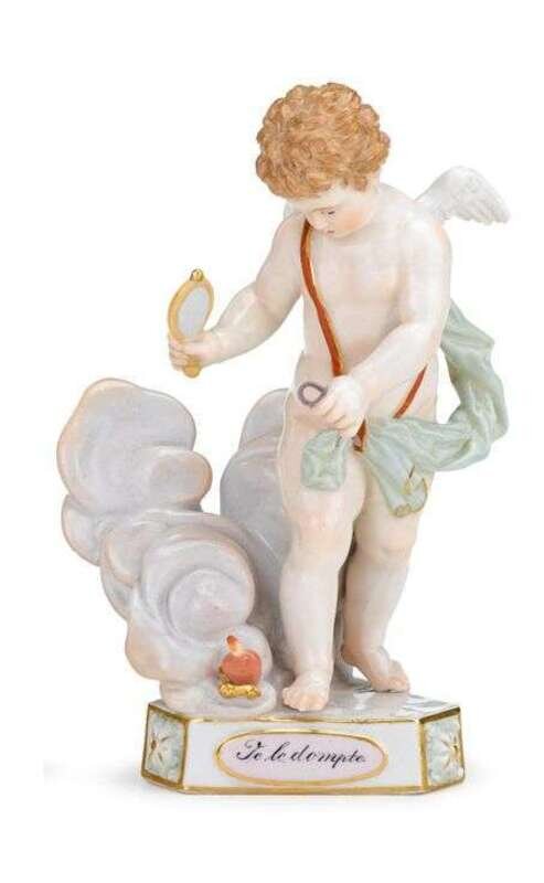 Modeled as a winged putto amongst the clouds, taming a fiery heart, the underside with underglaze blue crossed swords mark, incised "F 16", impressed "58", painter mark "HI" in red.