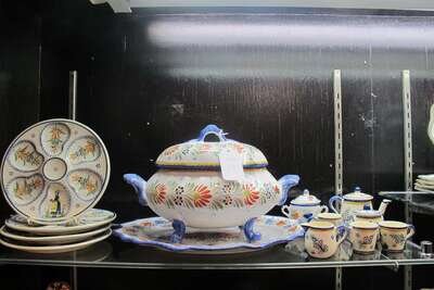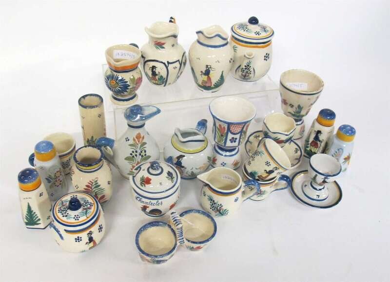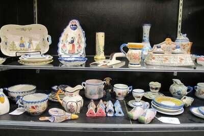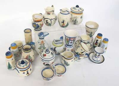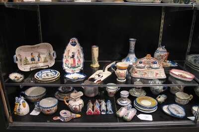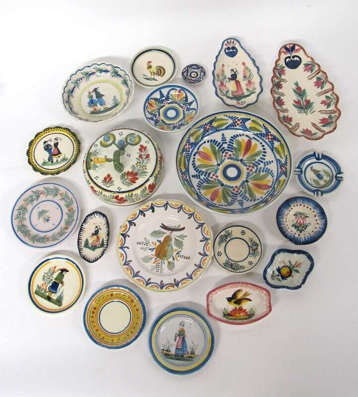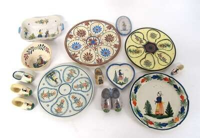 Including oyster plates, clogs, knife rests, bud vases, plates and serving dishes, creamers, gravy boat, salt and pepper shakers, etc. painted in a variety of patterns with florals and figures on a predominately white ground, all marked. (approx. 100 pieces).