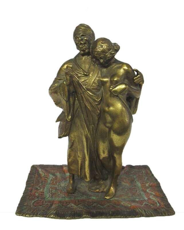 Modeled to depict a trader with nude female slave standing on cold painted persian rug, unmarked.