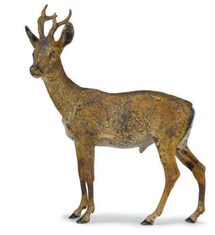 Cast and painted to depict an adult male deer, apparently unmarked.