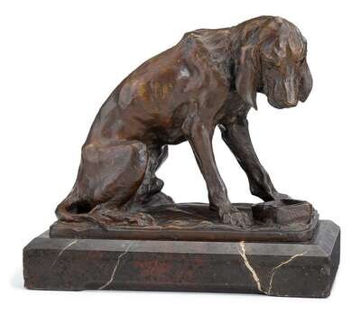 Mid-brown patina, the hound modelled seated above a bowl, on rectangular riotte rouge marble base, the bronze stamped "GRAUX-MARLY FRERES PARIS".