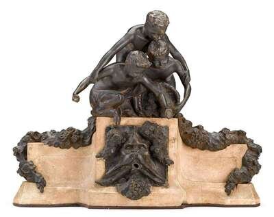 Dark-brown patina, depicting three playful young boys modeled as fauns issuing floral garlands over a shaped pink marble base mounted with a dophin mask and spout.
