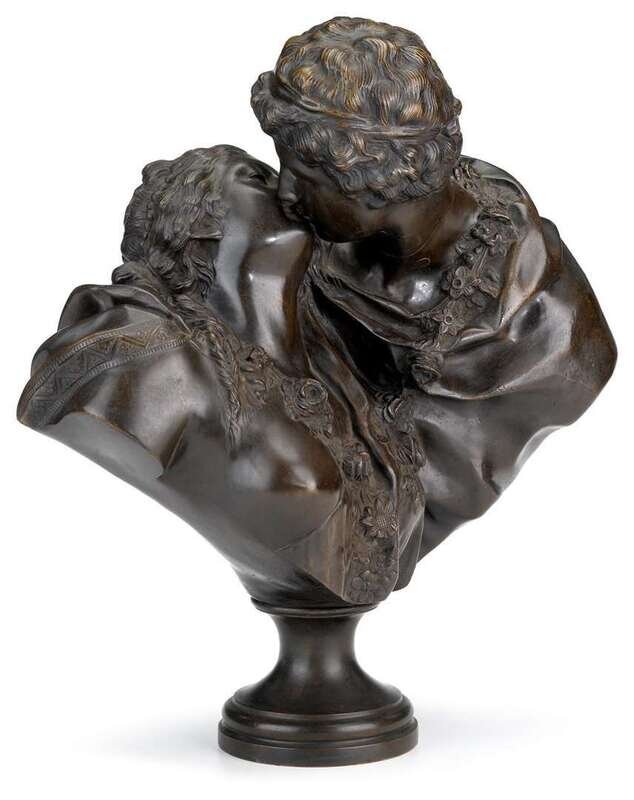 Brown patina, modeled to depict a young man and woman engaged in a kiss, drapped with a garland of flowers, signed "HOUDON".